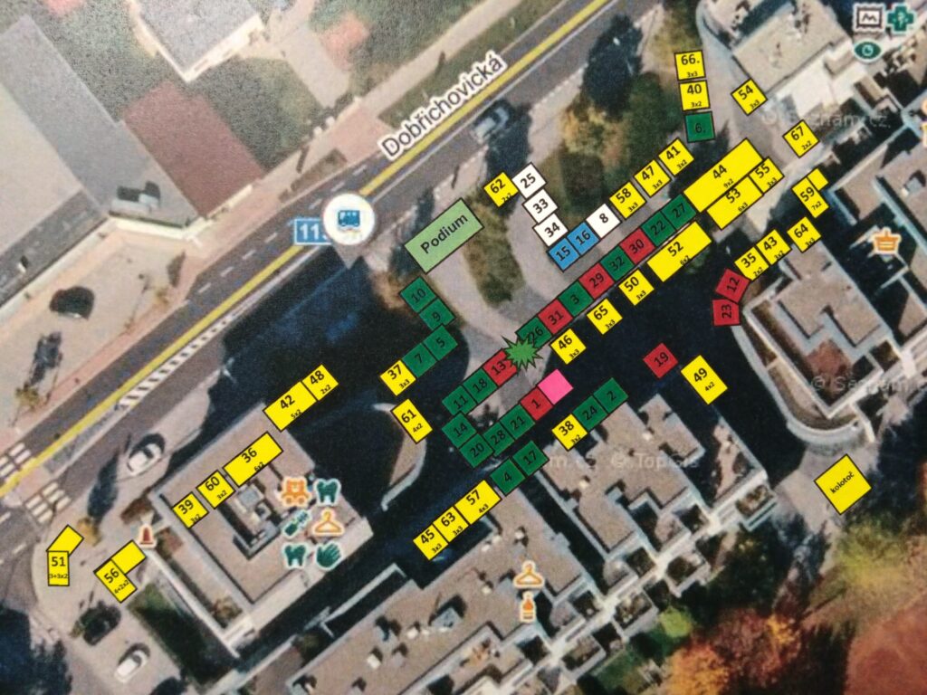 SEZNAM TRHOVCŮ A MAPA STÁNKŮ JSOU VLOŽENY NÍŽE POD TÍMTO TEXTEM. U Lavičky Václava Havla ve středu náměstí bude tento seznam a mapa vyvěšena. Nejprve si najděte své jméno v seznamu. Tam naleznete číslo stánku a Vaše umístění. Poté si na mapce najdete číslo stánku. Na stánku či místě pro Váš stánek bude cedulka s Vaším jménem.